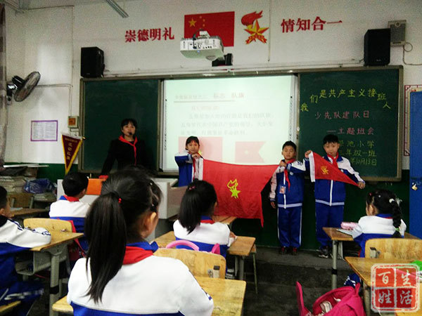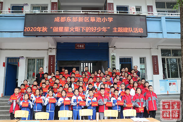 百姓生活网讯(陈晨)有一种颜色,飘扬在心中永不褪色,那是红领巾的颜色;有一种光荣,令人激动不已,那是中国少年先锋队的光荣。当庆祝新中国成立71周年的余温还未褪去,我们又迎来了第71个建队节,10月13日,成都东部新区草池小学隆重举行了以“做星星火炬下的好少年”为主题的建队节系列活动。 10月13日上午,各中队围绕“做星星火炬下的好少年”开展主题班队会活动,队员们通过认识小队旗和中队旗,学习佩戴红领巾,了解少先队的光荣历史、优秀少先队员的故事、唱爱国歌曲,抒发自己的理想和对中国梦的美好期望。 10月13日下午,全校师生齐聚操场,举行建队节庆祝活动。在庄严的出旗曲、嘹亮的队歌声中,主题活动开始了。两位主持人充满激情的话语,点燃了全体少先队员们的自豪感。他们在鲜艳的队旗下重温入队誓言:“热爱祖国,热爱人民,好好学习,好好锻炼,准备着:为共产主义事业贡献力量。”铿锵有力的呼号声在校园回荡,为共产主义事业而奋斗的信念在他们心中生根发芽。 有声有色的建队日活动结束了。今天,草池小学的少先队员们共同度过了一个欢乐、有意义的主题活动。此次活动不仅传承了少先队的优良传统,充分展示了新时期少先队员朝气蓬勃、健康向上的精神风貌,还激发了全体队员的荣誉感、自豪感和使命感,他们表示将好好学习,团结友爱,遵守纪律,共同奋进,努力争做一名优秀的少先队员,让胸前的红领巾更红更艳!