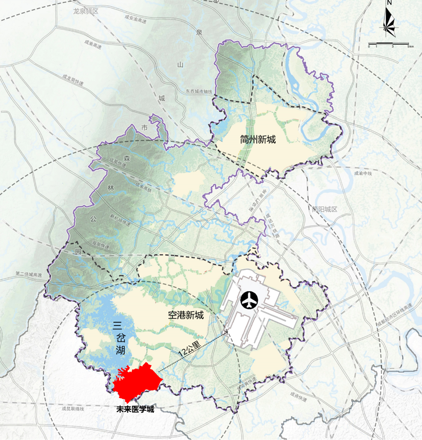 东部新区未来医学城 未来医学城位于成都东部新区南麓,片区范围约15平方公里,西侧紧邻三岔湖,东侧距离天府国际机场仅约12公里,未来将容纳约9.2万新老成都人。