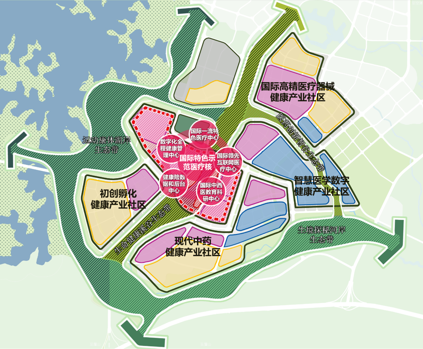 《草案》对标美国德州医学中心、波士顿长木医学区、新加坡启奥生物医药园等国内外知名生命健康产业片区,依托华西顶级医疗资源导入,提出“未来医学探索与创新前沿,医教研产融合与转化典范”的总体定位。 根据《草案》,未来医学城将规划形成“一核四带四区”的空间结构。 “一核”即国际特色示范医疗核,是未来医学城的功能核心和城市形象展示窗口,包括国际一流特色医疗中心、国际中西医教学科研中心、国际领先互联网医疗中心、数字化全程健康管理中心、健康险数据和后台中心5大产业功能。此外,结合中央生态绿廊集聚绿心公园、综合商业、会议、酒店等城市公共服务功能,建构国际医学交流中心。 “四带”指四条结构性生态绿廊,将打造成为健康主题的城市公园,形成运动康体湖岸生态带、生命健康溪谷生态带、生境探秘河岸生态带、医药创新智谷生态带——“四带公园”。 “四区”指四大健康产业社区,包括初创孵化产业社区、现代中药健康产业社区、智慧医学数字产业社区、国际高精医疗器械产业社区。实现居民由“被动医疗”到“主动健康”生活方式的转变,建设体现全生命周期健康管理理念的未来社区。